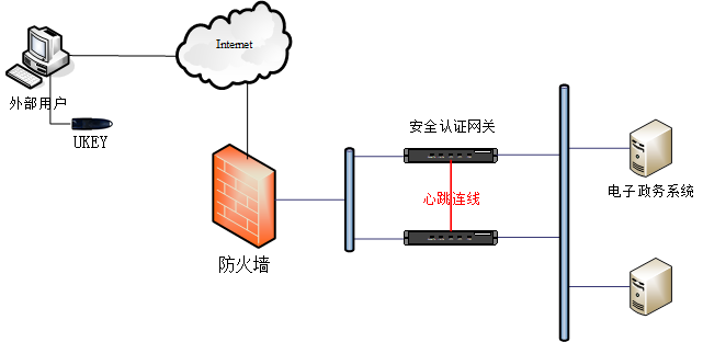 - 1) 安全认证网关部署在防火墙之后,热备部署。部署中心化、简单化,不改变整体网络的结构;